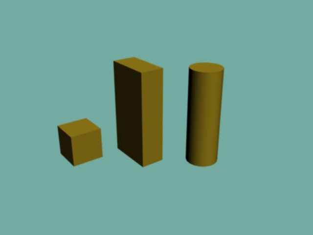 Create three shapes of the same color: (1) a cube, (2) a box with length twice the width and height twice the length, and (3) a cylinder with length three times the diameter. Render a perspective view that shows all three figures. Submit to the turnin folder as Last_First_Shapes,jpg.