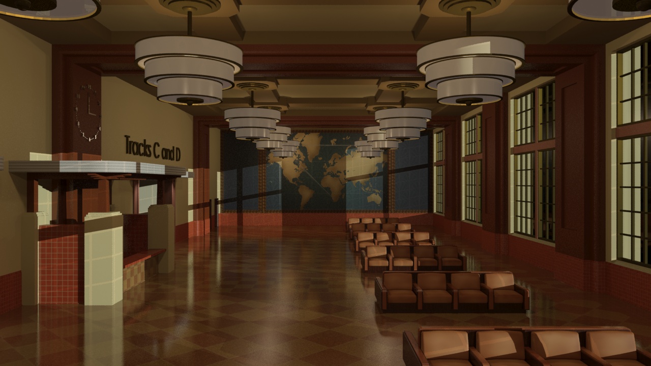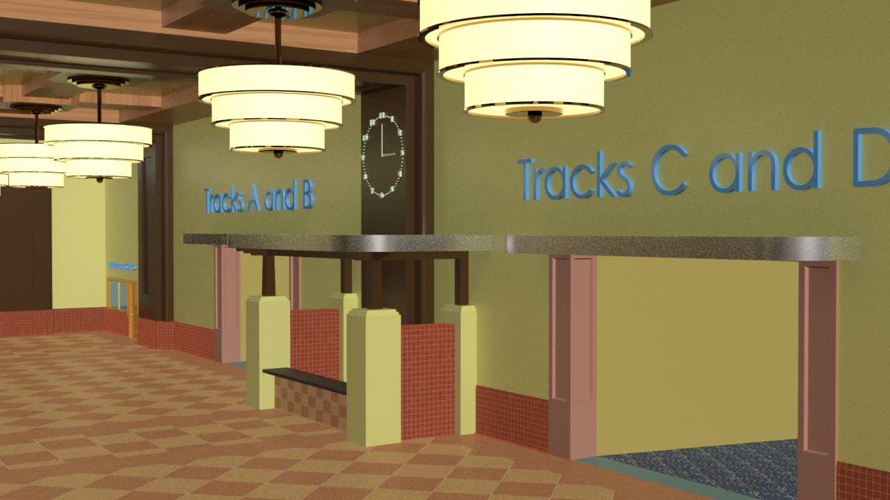 After completing Video 10 of the Art Deco Train Station series, use what you have learned to get the materials in the station looking better. In particular, pay attention to the ticket counter, the portion of the floor that has not already been addressed, the tunnels, the ceiling, and the window frame. Here's an example using Arnold.