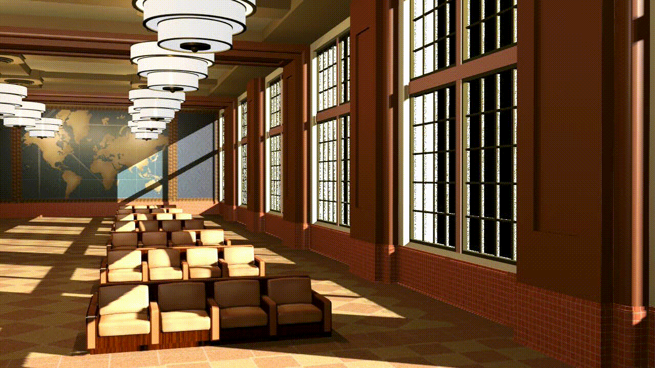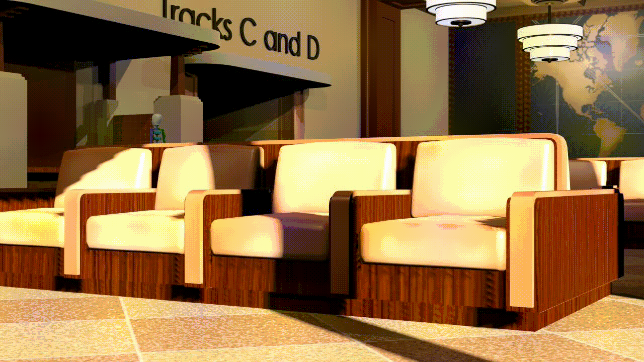 Look in the Read → Video Tutorials → Art Deco Train Station folder for a series of videos that will help us decorate a train station. View the videos in Part 1 (some of which will be review). When you get to video 6 (TV06), open the file 05_station_start_max (Notice the mismatch in numbering) and follow along. After completing video 7, render an image of your seating area that also shows the chandeliers and submit as Last_First_StationSeating.jpg. Then follow video 9 (using 09_station_materials_start.max), rendering another image afterwards and submitting as Last_First_StationPart1.jpg.